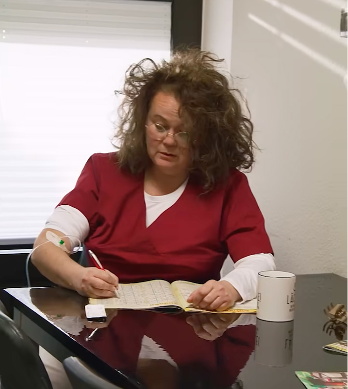 Petra steht wieder für die MFA-Serie "Der Pausenraum" in einer der Hauptrollen, als Schwester Renate, vor der Kamera. Produktion Brandneo GmbH.